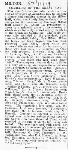 The Lymington and South Hants Chronicle reported on 27th of November 1919 that the New Milton branch of the Comrades of the Great War held a first anniversary dinner at the Milton Hall where 130 ex-servicemen attended. After the dinner there was entertainment provided from the members with songs, monologues and jokes.