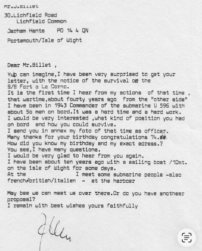 And to his amazement Korvettenkapitän Gunter Jahn, the Commander of the U-boat, U-596 that sank his ship, and who went on to become one of the most successful U-boat commanders in the Mediterranean Sea, was truly delighted that Joe got in touch.