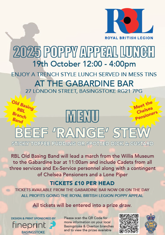 Once again, we will be launching the Poppy Appeal with a short parade from the Willis Museum, across the Top of the Town to the Gabardine Bar, where you can treat yourselves to a 'Range Stew' served in mess tins.