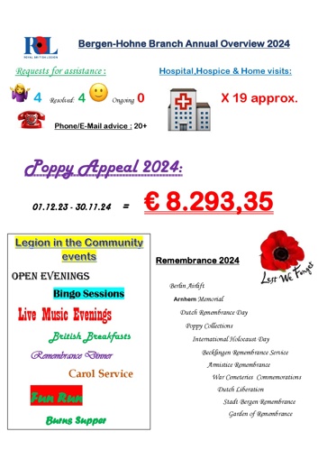 The Poppy Appeal is an important part of what we do here at the Royal British Legion Bergen-Hohne. It is a time to remember with gratitude and respect all those who have served and sacrificed, while also raising vital funds to support serving personnel, veterans, and their families. We are proud of the generosity shown by our branch and wider community each year, and thankful to everyone who helps us keep this tradition alive and make a real difference.