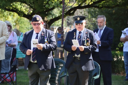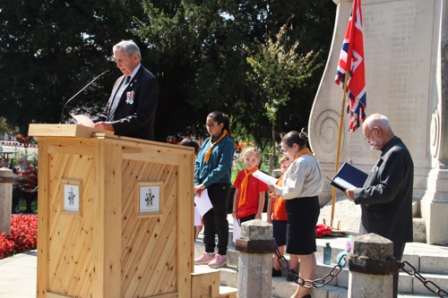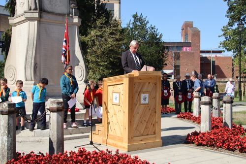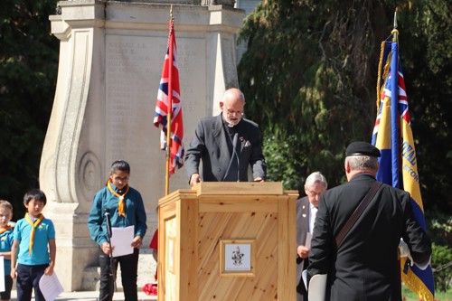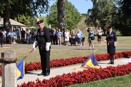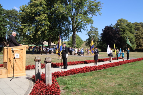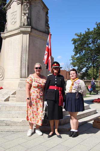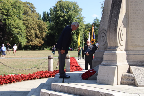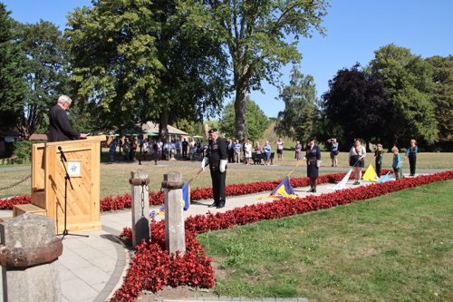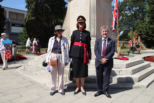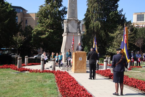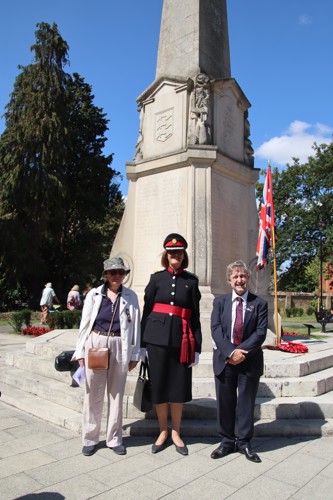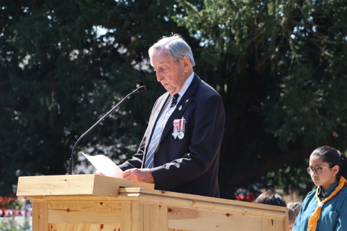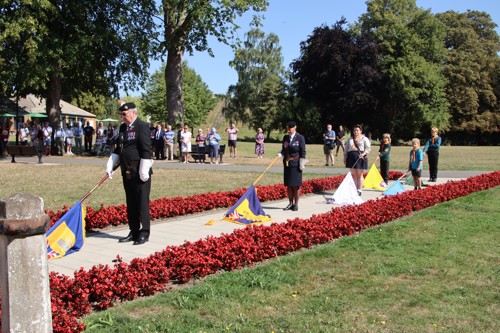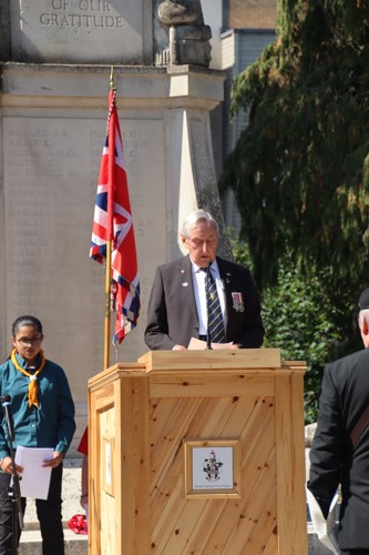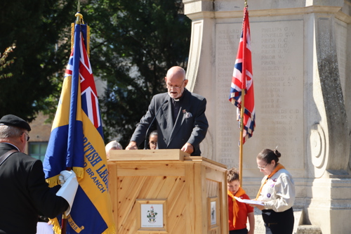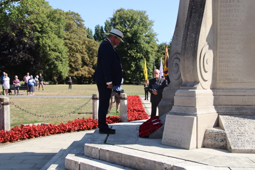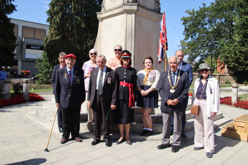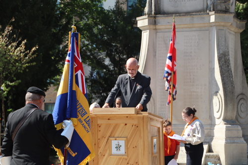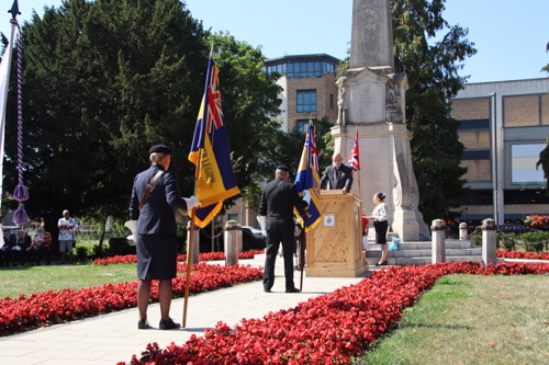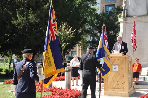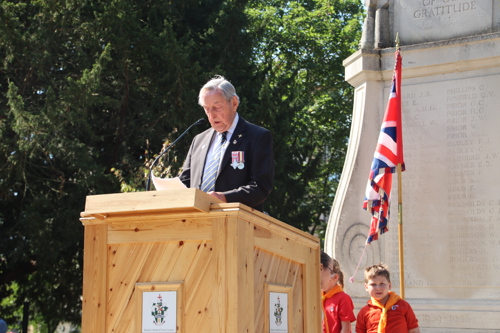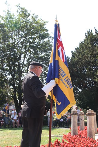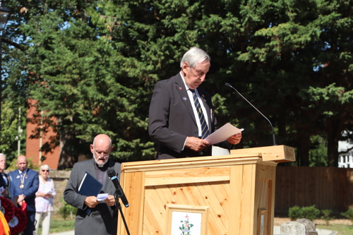 On Friday 15th August at 11.00am, RBL Branch President John B Robinson AFC* led the VJ Day 80 commemoration service at the War Memorial assisted by Rev. Tim Weeks. The Service included the Kohima Epitaph, two minutes' silence and Reveille with the audience joining in with the hymn “I Vow to Thee my Country” and the National Anthem.