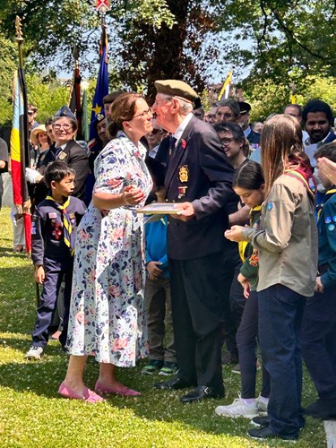 La présidente de la branche, Zoe White, a remis à Henri un certificat d'appréciation au nom de la branche lors de l'acte annuel de commémoration tenu à Evere le 21 juin 2025.