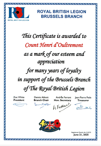Henri joined the Brussels branch of the Royal British Legion in 2002. “It is a wonderful organisation,” he says.