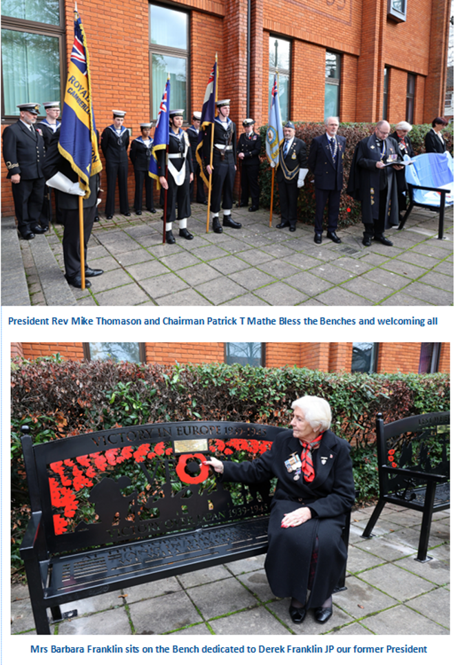 Branch Chairman Patrick Mathe announced at the Relaunch Day a new Appeal to raise funds for two memorial benches to be located at High Cross Church in Camberley Town Centre hopefully in time for Remembrance Day in November 2025. The Benches will commemorate WW1 and WW2 as part of VE day celebrations. Each Bench will also commemorate two of our members our passed President and Chairman with nameplates Mr Derek Franklin and Mr David Kemp MBE. The Appeal raised a staggering £300 at the Branch Relaunch day. Please give Generously where you see the Blue Buckets or contact us on 07860 239376. Thank you.