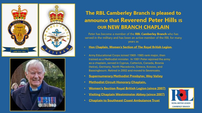 WE ARE VERY PLEASED TO BE ABLE TO ANNOUNCE THE APPOINTMENT OF OUR NEW CHAPLAIN FOR THE RBL CAMBERLEY BRANCH