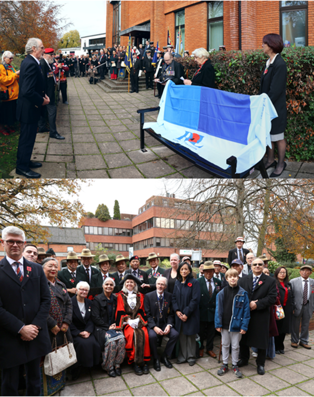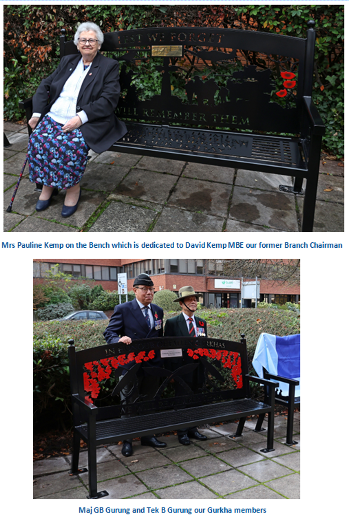 The Royal British Legion Camberley Branch presented 4 memorial benches in memory of all those who had served in all conflicts and are serving now. Two of the memorial Benches were dedicated to Derick Franklin our former long serving President and David Kemp MBE our former Chairman. One bench was presented by our Gurkha member brothers' and sisters' for all Gurkhas who have served and are serving and the last bench was for all those who have served in all conflicts as Doctors, Medics, Nurses, Intelligence, Air and Sea rescue very often overlooked and all who save lives and keep us safe. Below see pictures provided by our friend Alan Meeks.