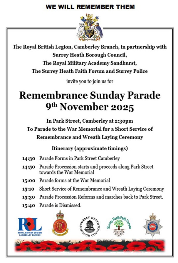 THE ROYAL BRITISH LEGION CAMBERLEY BRANCH REMEMBRANCE SUNDAY 9TH NOVEMBER 2025. 'we will remember them'