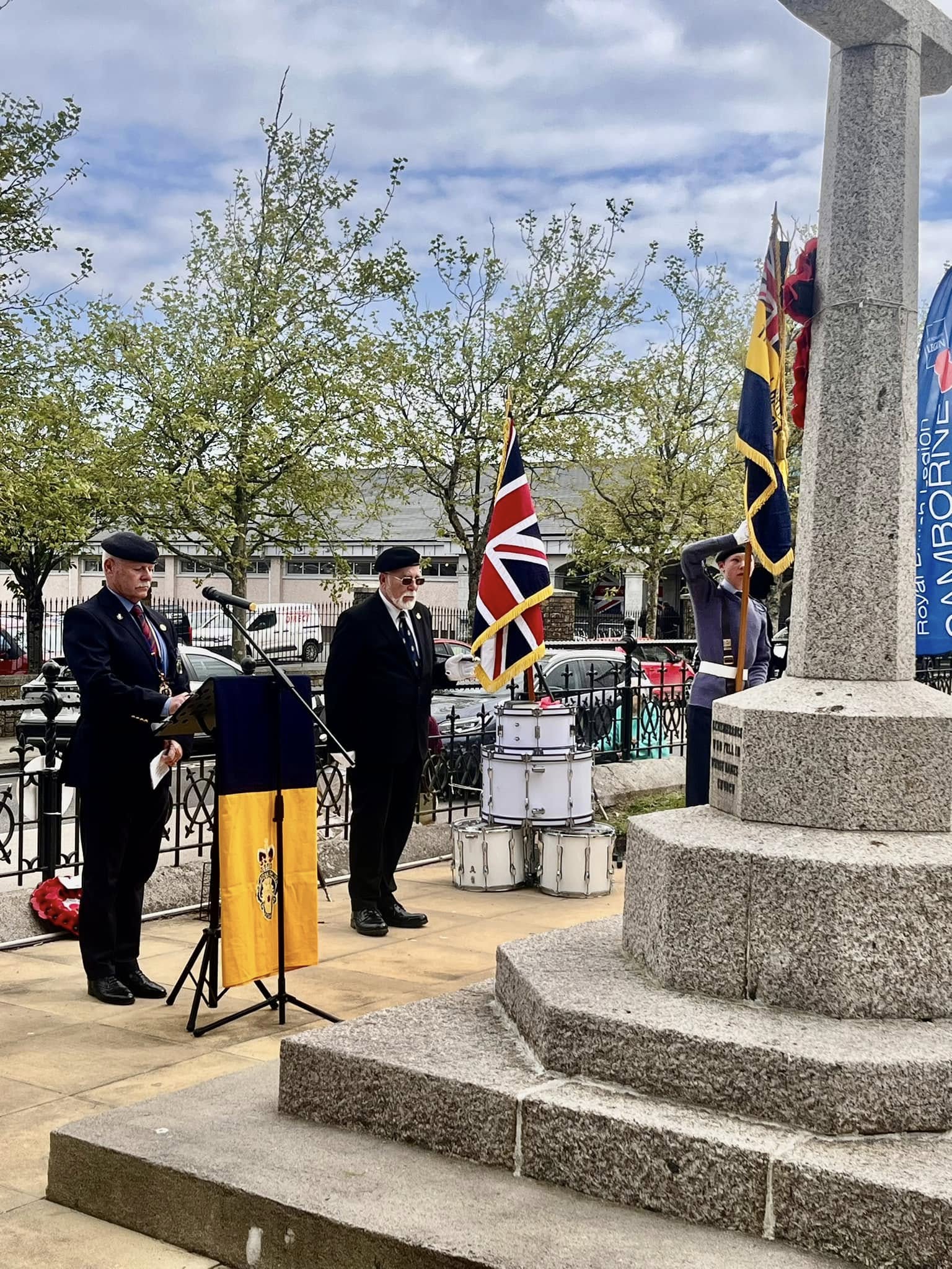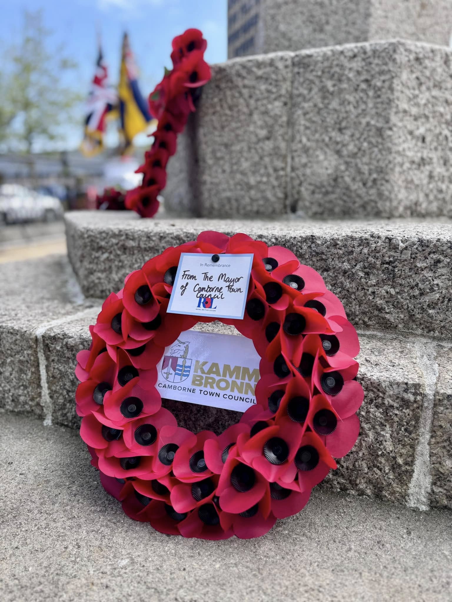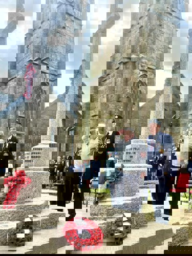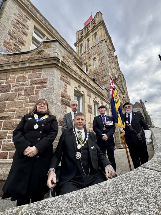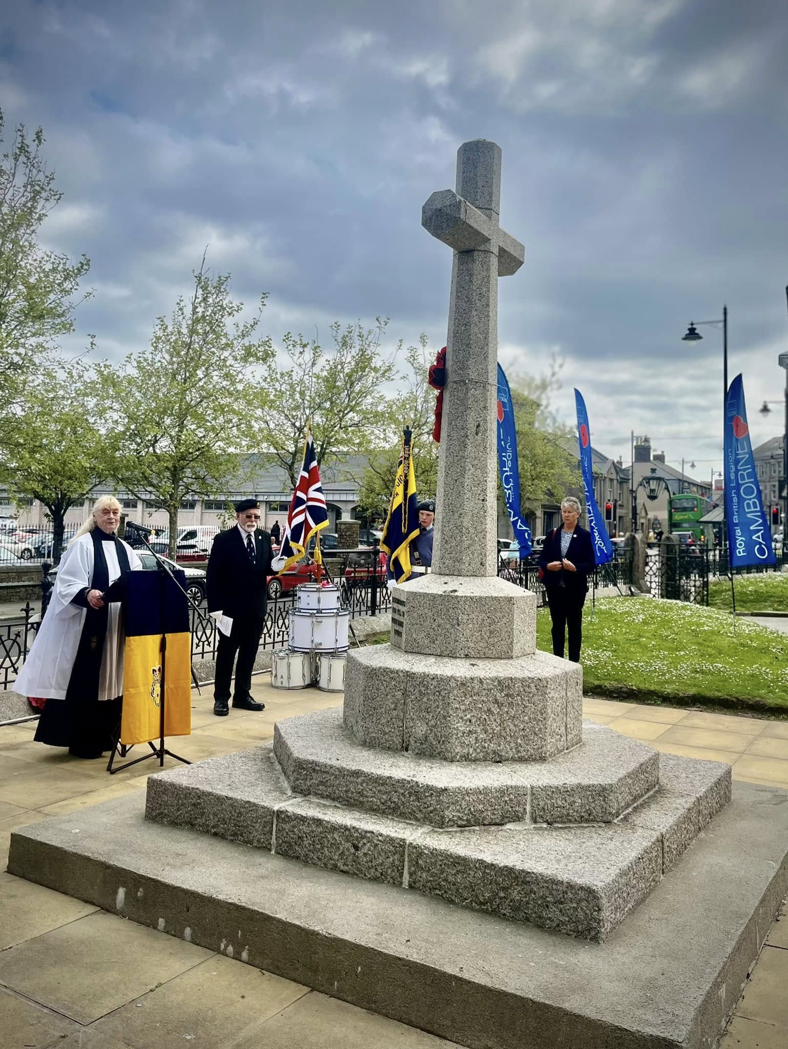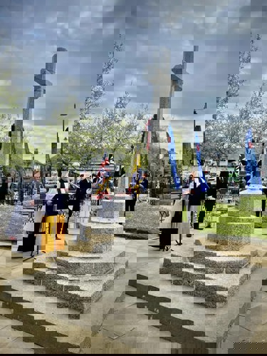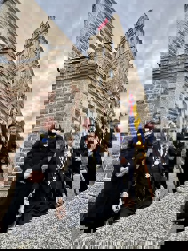 Camborne's VE Day 80 commemorations started at 9am with the raising of the VE Day 80 flag above the Passmore Edwards Building with the VE Day proclamation by the Mayor.