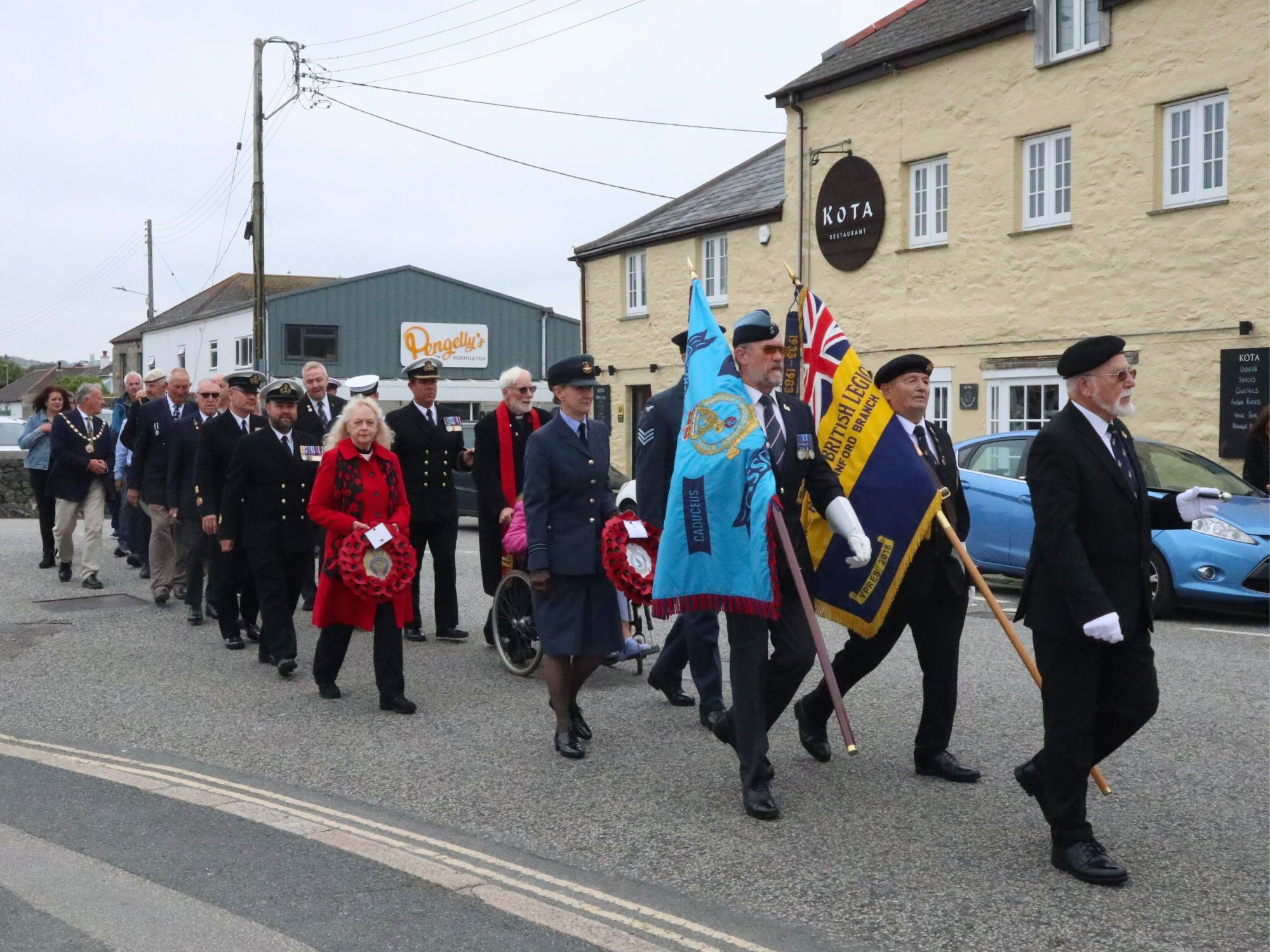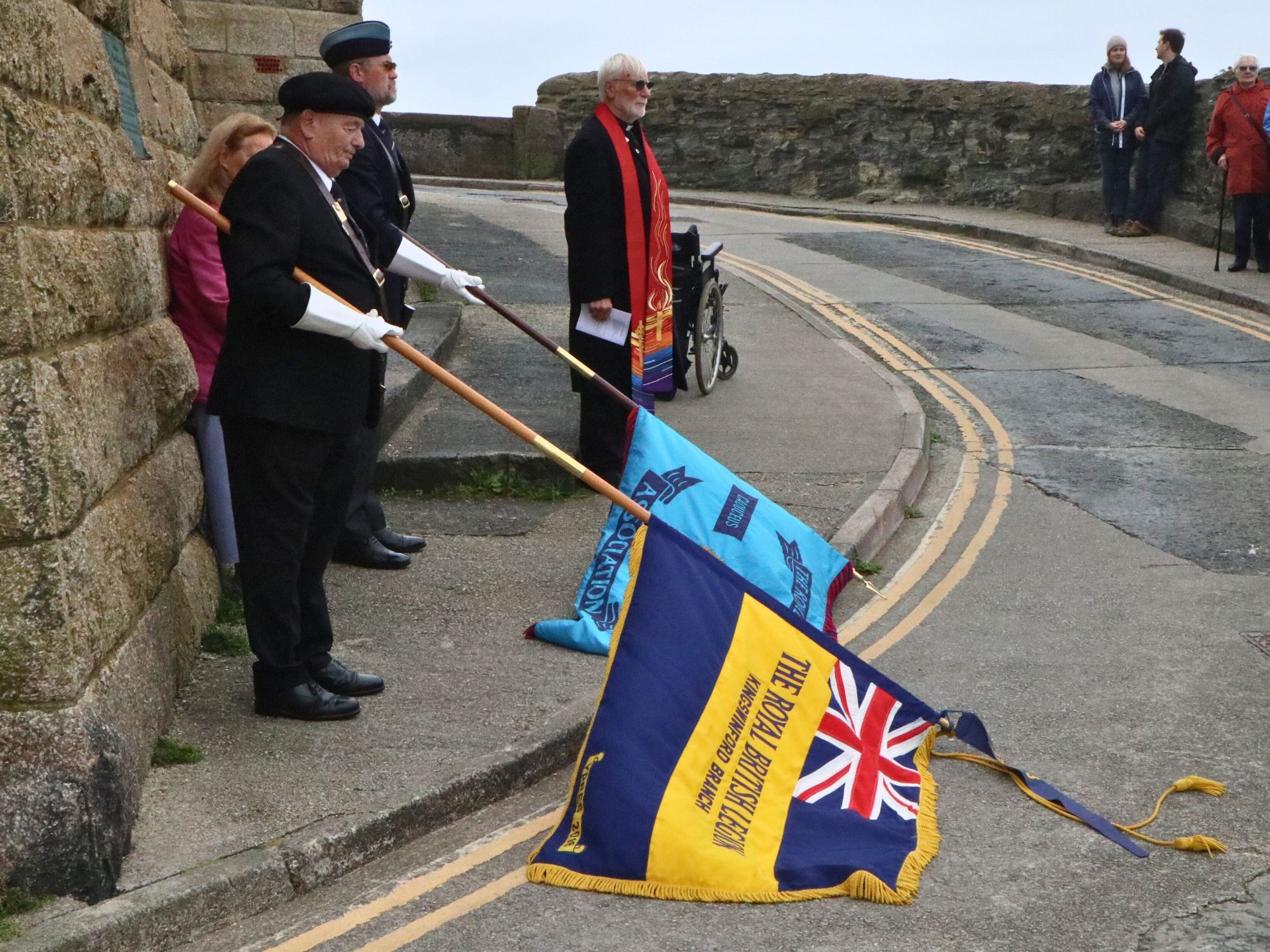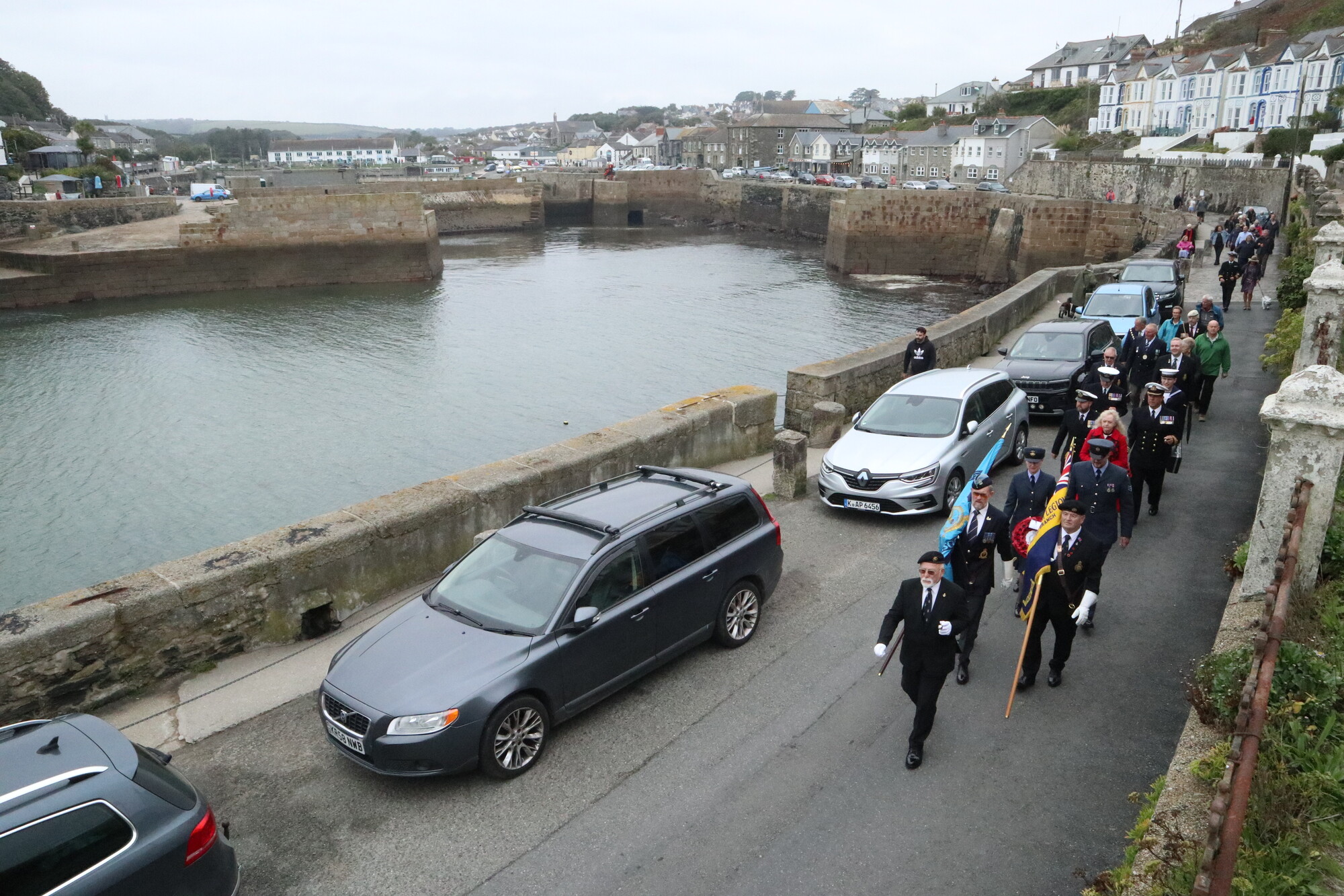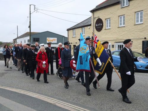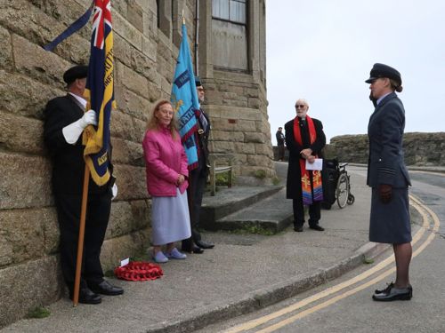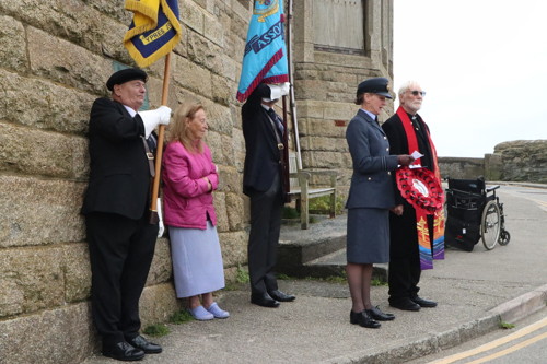 Following a procession along the harbour, a short service was held beside the memorial plaque at the base of the clock tower of Porthleven’s Bickford Smith Institute Building. Leading the service was Reverend Mike North alongside organiser Beatrice Kerno of the Porthleven Old Cornwall Society.