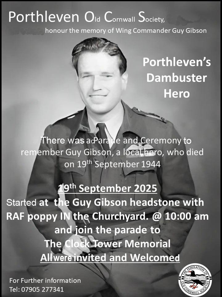 On the morning 19th September 2025 representatives from RAF St Mawgan joined Royal Navy personnel from RNAS Culdrose, local veterans, members of the Old Cornwall Society, church representatives and residents from Porthleven to remember Dambusters hero Wing Commander Guy Gibson.
