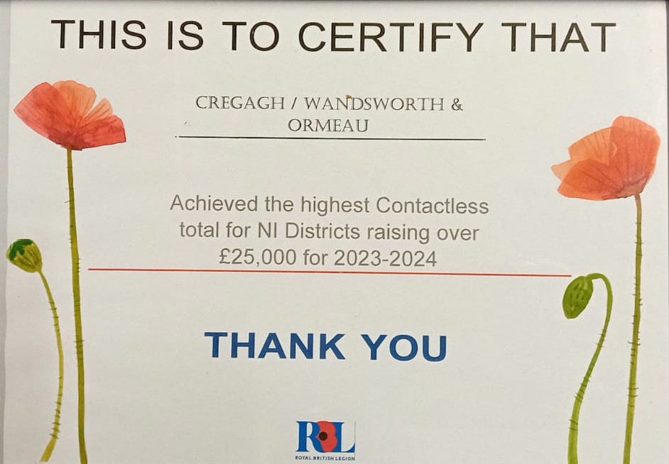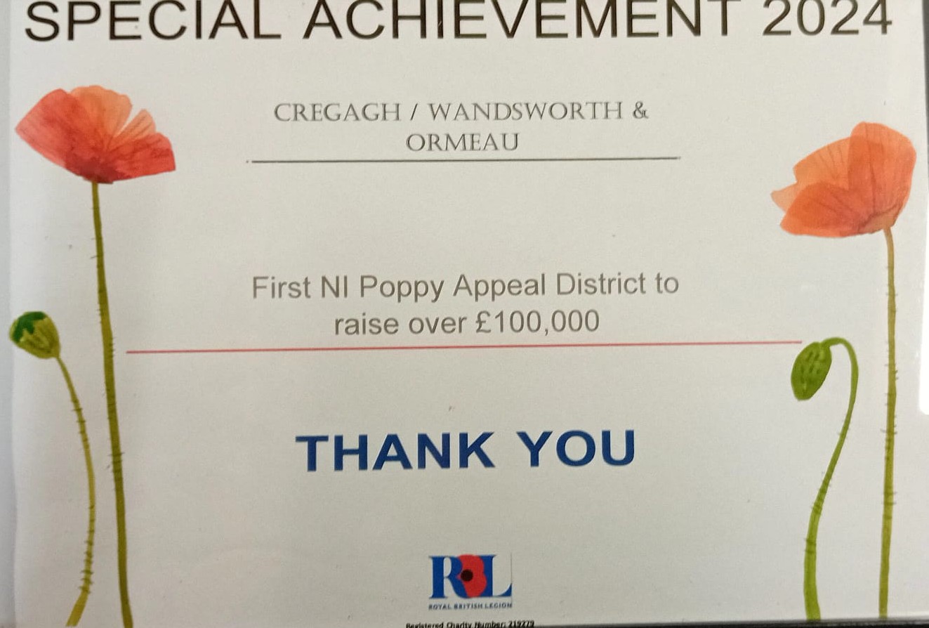 · The second was for raising more than £100k in the 2024 poppy appeal. The branch was the first in Northern Ireland to do this.