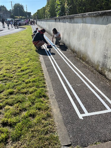 A late start - 09:20 hrs - and our longest day - was also the brightest. Passing through Trun, we found the primary schools were busy painting stars and stripes on the pavements - this picture shows just one of many places;