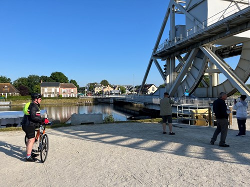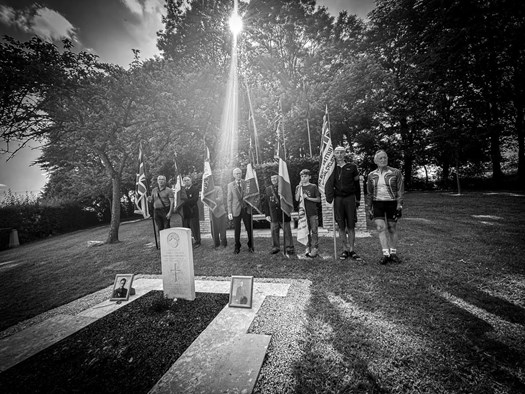 Our first stop, Pegasus Bridge was 3.7 miles into the ride and the first target of 06/06/1944, with the sites of the final positions of the Horsa gliders marked for ever now in stone. The queue at Café Gondrée (on the other side of the river) was way out the door, and as this was our first day, we pressed on another half mile to Ranville CWGC; laid our wreath (made by the Marton and Nunnthorpe Knitters) after saluting the fallen there with The Exhortation, The Last Post - played on a bluetooth speaker - and our Branch Standard dipped in Act of Honour.