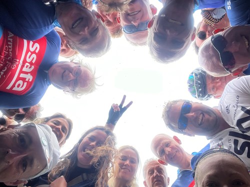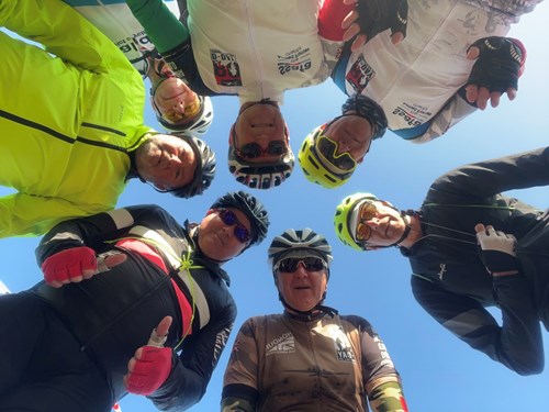 22 miles on the D572 to Bayeux, using cycle lanes where they were available, and braving the briefest of showers put us at the CWGC at 11:00 for another ceremony. As we finished, a large group of SSAFA cyclists approached and, after a brief discussion, we agreed to provide music and Standard for their wreath laying ceremony. Afterwards, across the road, I took their offer to take their group shots up a few notches with a couple of "mousies" - and then asked them to gather round for one of these...