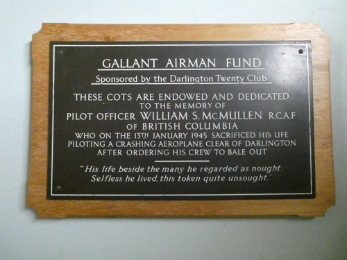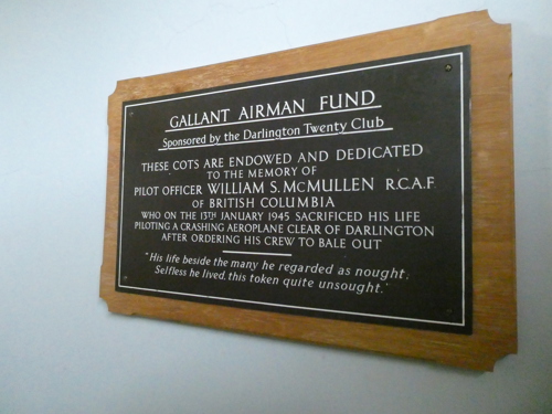 Gallant Airman Plaque for J/90038 Pilot Officer William Stuart McMullen, 428 Ghost Squadron (Usque Ad Finem) Royal Canadian Air Force (Pilot), who sacrificed his own life to save the town of Darlington at 8.49pm on 13th January 1945. (See further details at "War Memorials (External)" on this website)