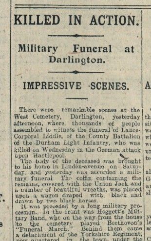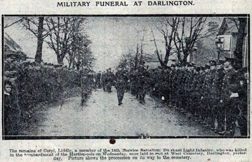 His body was returned to Darlington where he had lived with his parents at Hummersknott Lodge, beside West Cemetery, and later in Linden Avenue and where he had recently been married. His horse-drawn funeral cortege was attended by numerous civic dignitaries and he was honoured with a military gun salute