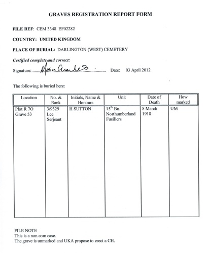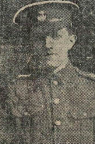 Although the inscription and contemporary newspaper articles describe him as a Corporal, his rank was Private. In his graves registration report form the rank “CORPORAL” has been crossed out and “PRIVATE” substituted