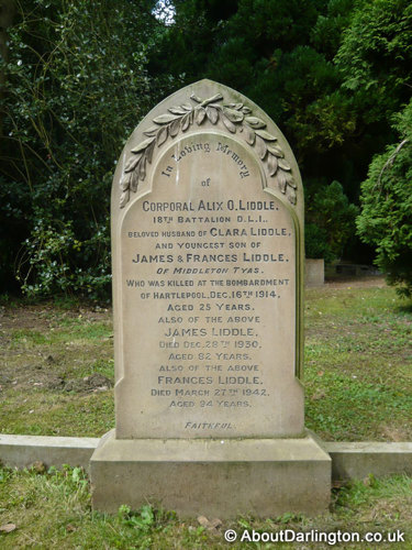 Alix was born to James Liddle and Frances Middleton [His birth was recorded 1st quarter 1889 as "Liddell Alix Olef"]. His brothers were Sidney, Bertram, William and Arthur. sisters Frances (Gainford), Winifred (Bailey) and Rose (unmarried). He married Clara Mains in April 1914, enlisted in September 1914 and was killed in December 1914.
