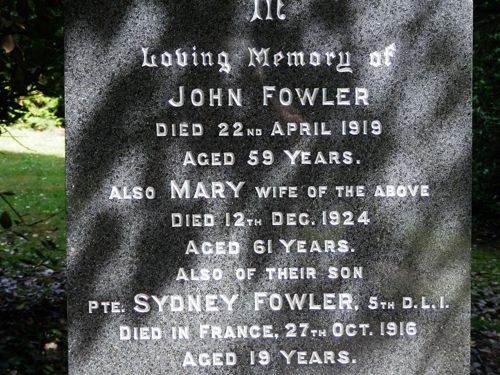 3978 Private Sydney Fowler - 1st/5th Battalion, Durham Light Infantry - Died 27/10/1916 Aged 19