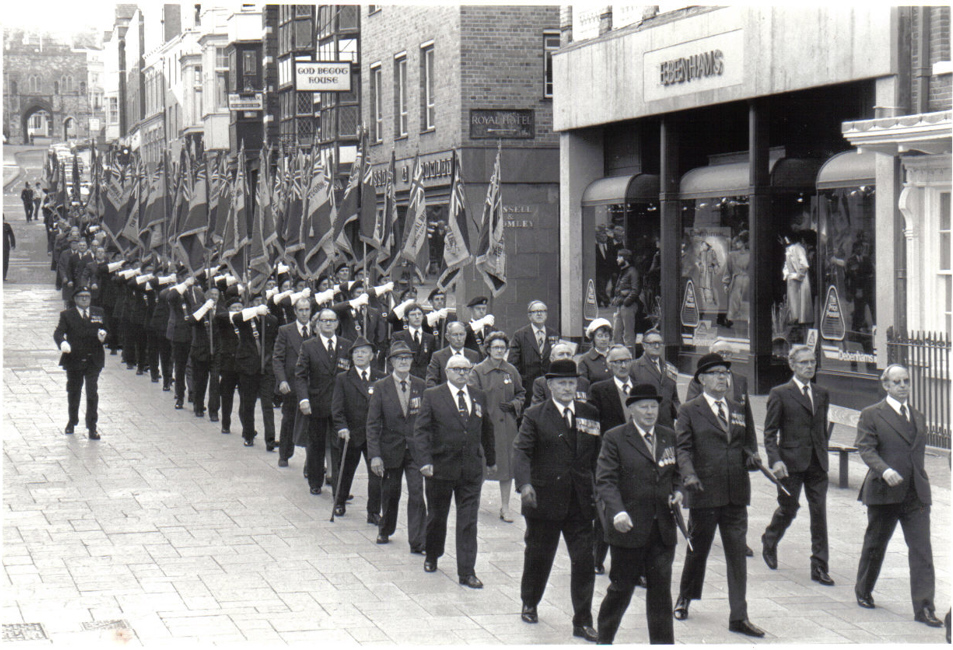 Lt Col Alan Howard, Branch Chairman (and Hampshire County President) leading the Members of the Branch, followed by branch standards from across the county, and beyond. Members from other Hampshire branches and the Regimental Standards bring up the rear of the parade.