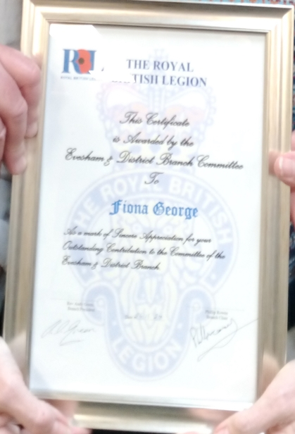 Presentation 2024 Rev. Andy Green and Branch Chairman Phillip Rowne - Speed presenting Fiona George with a Poppy Appeals Award for her efforts in fundraising for the Royal Legion Evesham Branch.