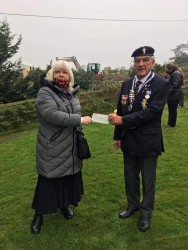 2020 - A cheque to the value of £1800.00 was presented to Mr Bill Dawber, Chairman and Poppy Appeal Organiser by Mrs Sandra Clarke after the Remembrance Service which took place outside due to Covid restrictions. Sandra had manufactured face masks and sold Poppy Pin Badges, absolutely fantastic donation, thanks to all who donated along the way.
