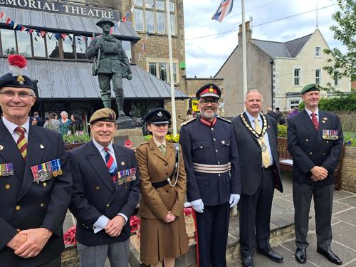 Memorial Theatre with knitted poppies and below ready for Remembrance Sunday