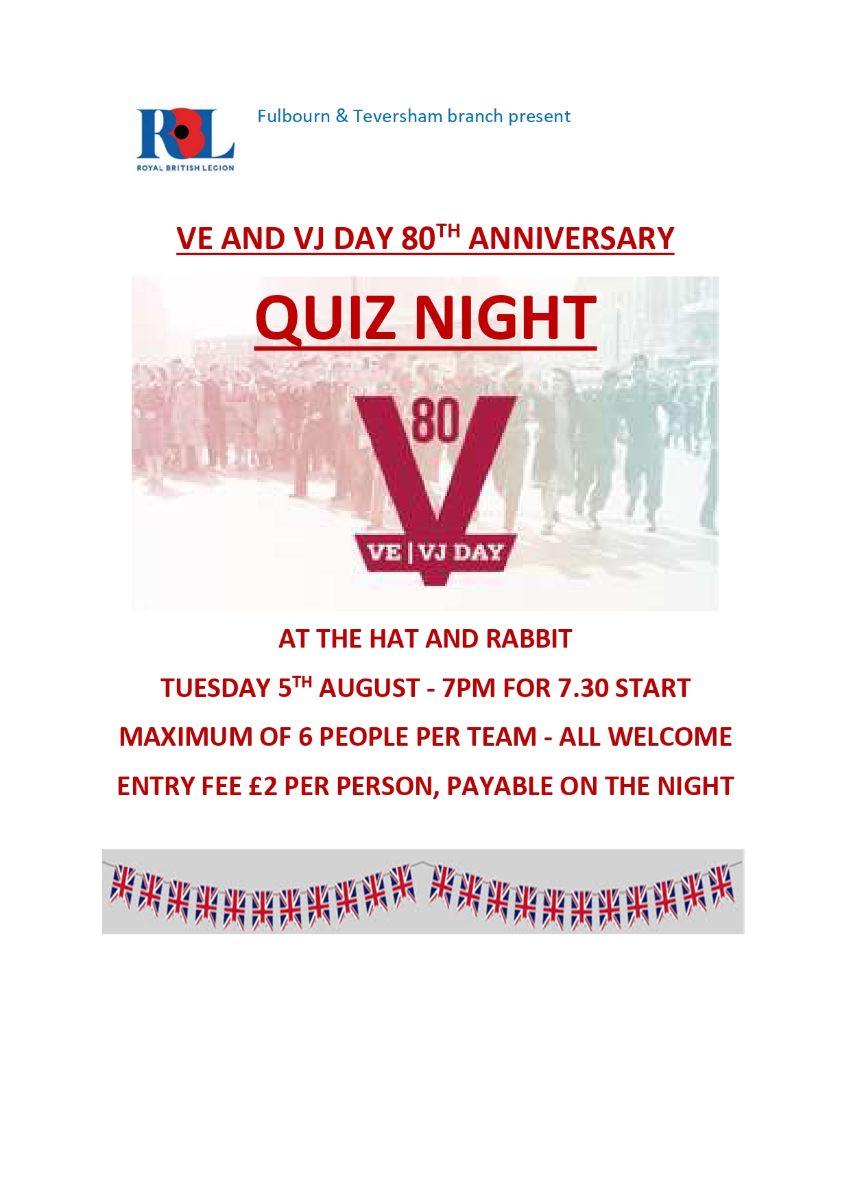 As part of our celebrations for VE and VJ Day, the branch held a successful quiz night at the Hat and Rabbit on Tuesday 5th August.