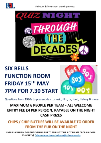 Friday 15th May at The Six Bells Function room. From 7pm.