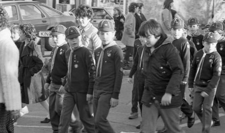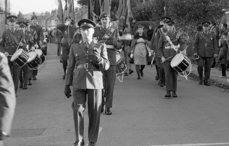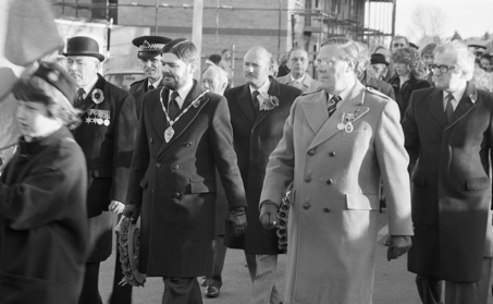 Halstead Royal British Legion Branch Remembrance Sunday 1985 Halstead Royal British Legion Branch - Remembrance Sunday 1985 Above: Roy McDowell (carrying wreath), Michael Gage (dark rimmed glasses) and Percy Meadows (on the far right with the two meadows). Jackie Pell, dark haired lady to the rear of the procession. Mayor of Halstead, Tony DeFrates. Michael Portway (light coat with 2 medals) Michael Gage (dark rimmed glasses) far right to the front. Percy Meadows (closest the camera with two meadows)