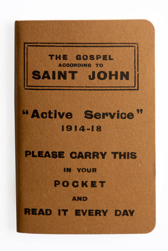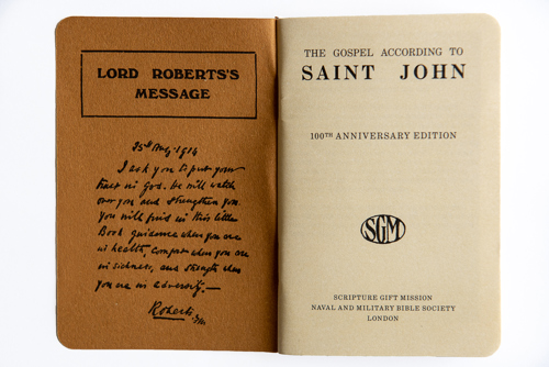 The Active Service Gospels and New Testaments were made to fit in the top pocket of a uniform, with rounded edges to prevent creasing. They had hymns at the back so that chaplains could use them to lead church services, and a decision form that soldiers could sign as a declaration of faith. Each one had the message from Lord Roberts on the inside. “I ask you to put your trust in God” it read, and many did.