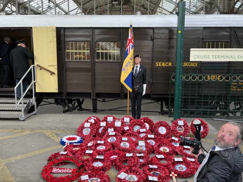 On Wednesday 5 November 2025, the Branch Secretary John Healey and Branch Standard Bearer, Alan Richardson represented the Branch at the South Eastern Railways Remembrance Service at Dover Cruise Terminal 1. The event commemorated those railway workers who lost their lives during two World Wars. It was a suitable moving event made more poignant by the Cavell Carriage providing the backdrop. This is the carriage that was used to convey he remains of Nurse Edith Cavell in 1919 and The Unknown Warrior in 1920.