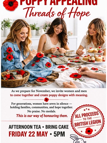 This will take place at The Daadi Clothes Swaps shop in Jalon (Carrer Gata de Gorgos, 6, 03727 Jalon). Debbie Brettle from the Royal British Legion will be joining us to talk about their work and how we can help. We aim to bring creative people together, whether you are a crafter, seamstress, knitter or crochet fan or would like to learn a new skill by getting involved, this project needs to get off the ground. We welcome your ideas text Poppy if you would like more information.
