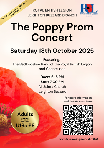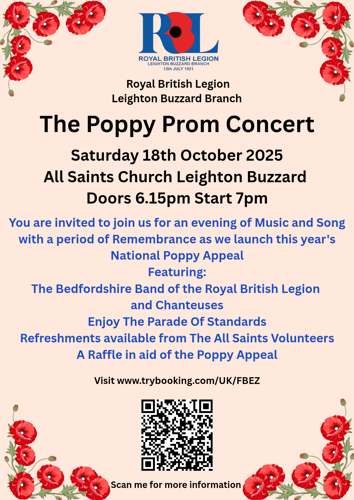*Saturday 18th October 2025. The Poppy Prom Concert. All Saints Church, Leighton Buzzard. Concert starts 7pm. Doors from 6.15pm. Featuring The Bedfordshire Band of the Royal British Legion and Chanteuses. Tickets £12 - Adults, & £8 - U16s. Raffle and Refreshments. Help us launch The National Poppy Appeal.