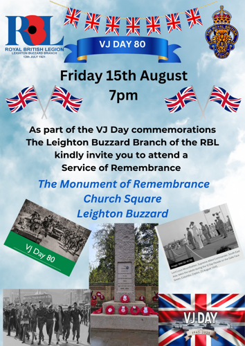 *Friday 15th August 2025. War Memorial, Church Square, Leighton Buzzard - 7pm - VJ Day Service of Remembrance (To include Wreath laying/Parade of Standard & live Trumpeter). Everybody welcome.