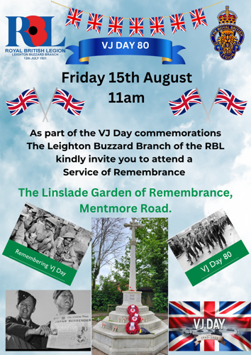 *Friday 15th August 2025. Linslade Memorial Gardens - 11am - VJ Day Service of Remembrance (To include Wreath laying/Parade of Standard & live Trumpeter). Everybody welcome.