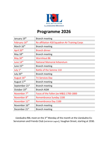 Below is a list of dates for your diary on what's happening in the Llandudno Branch of The Royal British Legion. Branch meetings are held at the Ex-Services Club, Vaughan Street, Llandudno on the third Monday of the month at 19:30.