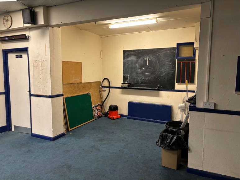 We repurposed the former dartboard area as a new cloakroom, providing members with additional convenience. The dance floor railings received a thorough cleaning and fresh coat of paint, while new curtains and nets brighten up the entire room. The bar area also underwent a deep clean to complete the refresh.