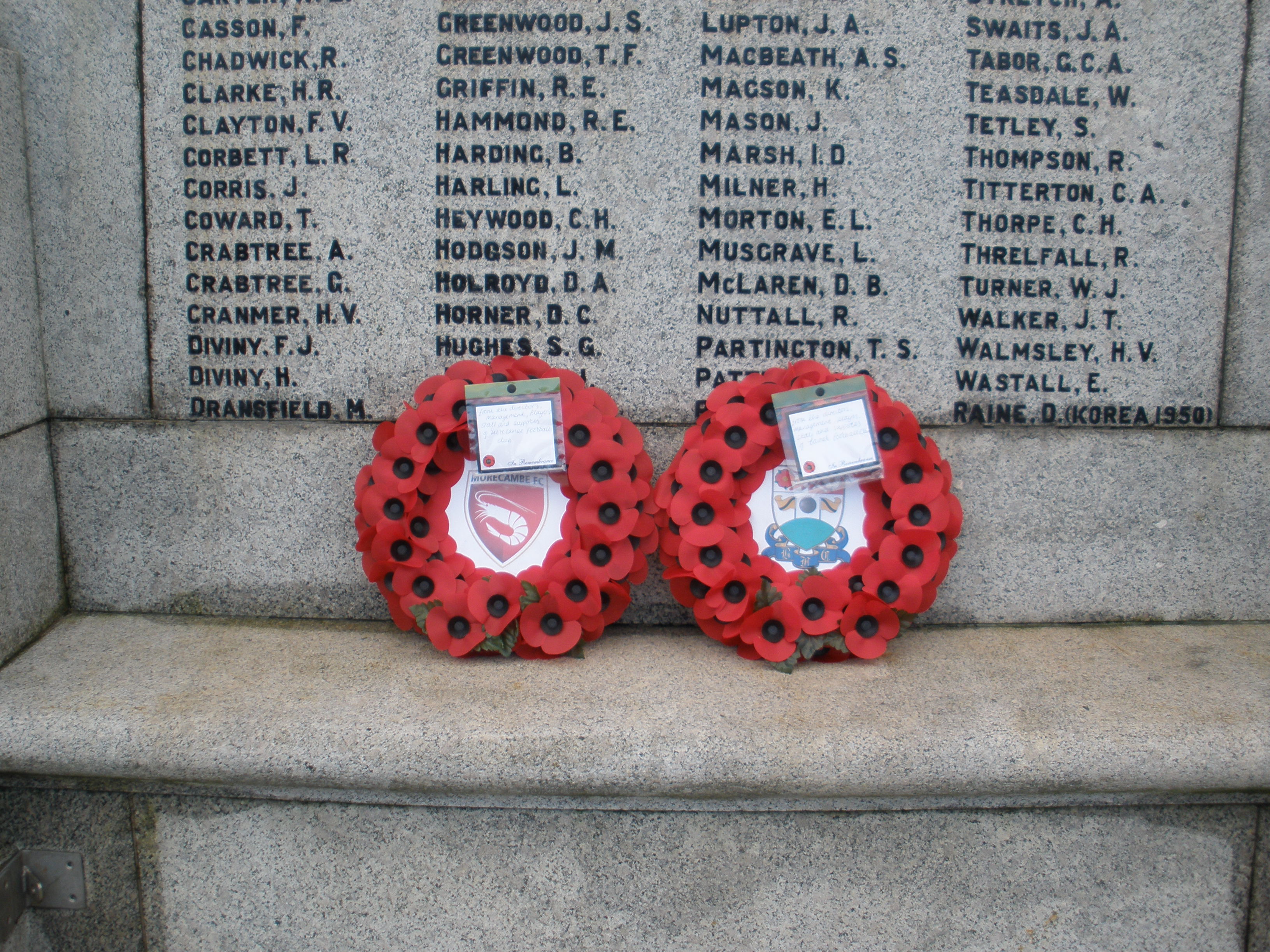 In 2011, a similar ceremony took place at the Globe Arena when Morecambe FC played Sheffield Wednesday FC in the First Round of the FA Cup on the afternoon of Remembrance Sunday and Morecambe were narrowly defeated by two goals to one. The Wreaths laid on the Centre Spot by the Team Captains prior to the game were later placed on the Morecambe Cenotaph. Click here to view the Cenotaph and here for a close-up of the Wreaths showing the Team Crests.