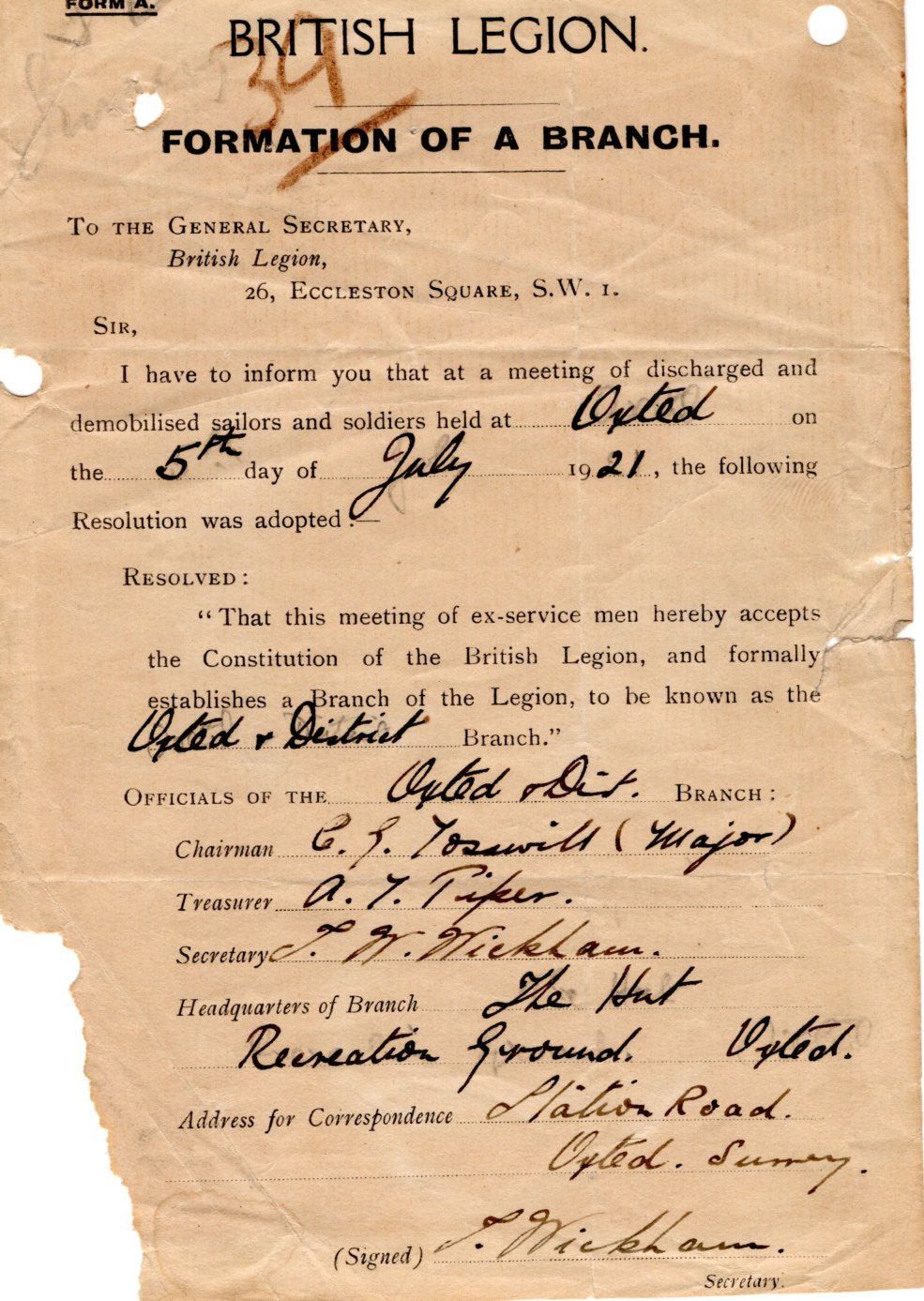 This Branch was formed in 1921(see certificate) from the Oxted Branch of the Comrades of the Great War originally formed in 1918. In its early years, it operated out of a hut in Master Park – In 1926 a local landowner, Charles Hoskins Masters, donated some money, as did other local businesses, and constructed this Club House (photos) – expressly for the use of this Branch. The Club building was officially opened in December 1926 (Ceremony). On 22 January 1927, the land and the building were formally given to the Branch by a Declaration of Trust “to and for the use and benefit of the Oxted & District Branch”. This made the Branch, and specifically its ‘Committee of Management’, the Trustees for the land and the Club House. It also means that the Trust is a non-incorporated charity in its own right. Branch History page. Branch News cuttings 1925-27 .