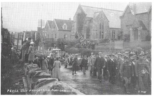 The 1945 Peace Parade marking the end of war WW2 in Europe. Opposite the White Lion/Old Mill and in front of the Methodist Hall in the High Street