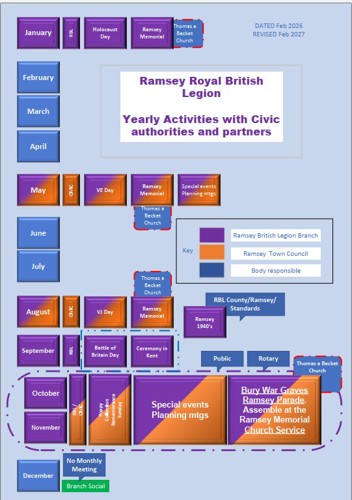 Below is an image showing the activities that Ramsey & District Branch undertake on an annual rolling cycle. All these activities are a team effort between the Branch and Ramsey Town Council and on Remembrance Sunday, Ramsey Rotary too.