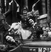 Upon the defeat of Germany, celebrations erupted throughout the western world, especially in Great Britain and North America. More than one million people celebrated in the streets throughout Great Britain to mark the end of the European part of the war. Queen Elizabeth, accompanied by Prime Minister Winston Churchill, appeared on the balcony of the palace before the cheering crowds. Princess Elizabeth (the future Queen Elizabeth II) and her sister Princess Margaret were allowed to wander incognito among the crowds and take part in the celebrations.