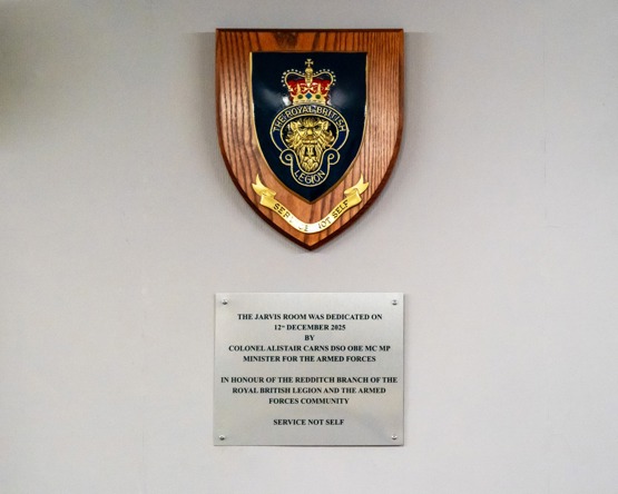 The Minister for the Armed Forces, Alistair Carns DSO OBE MC MP, dedicated the committee room as the "Jarvis Room," alongside Chris Bloore MP for Redditch and the Villages. The room was blessed by Father Jason Mahoney. Kenneth was a founding member of the Royal British Legion Redditch Branch, established on 21st September 1921.