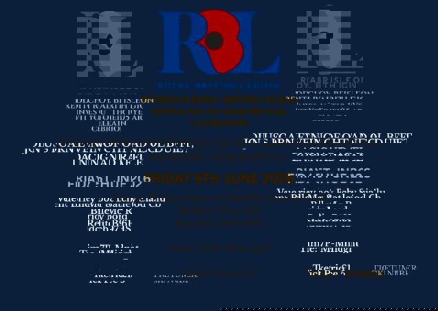 Royal British Legion Redditch Branch 105th Anniversary7pm Friday 5th June 2025 at Bridley Moor & Batchley Social ClubSmart dress – black tie, dress below knee or trouser suitHot & Cold buffetDancingRaffleTicket Price: £15 For tickets E-mail: [email protected]
