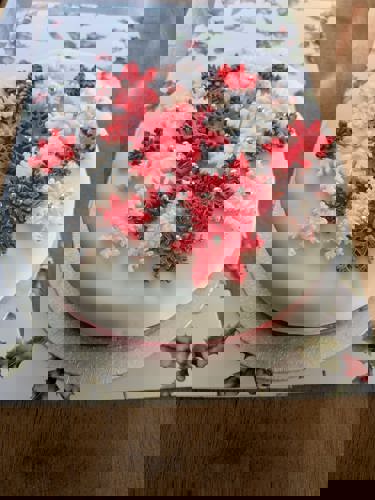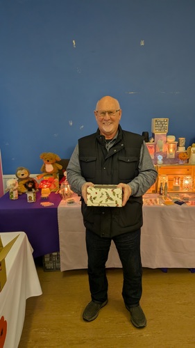 We had 2 raffle prizes available. The first was for a wonderful handmade and decorated Christmas cake, made by our Treasurer. This was won on the day.