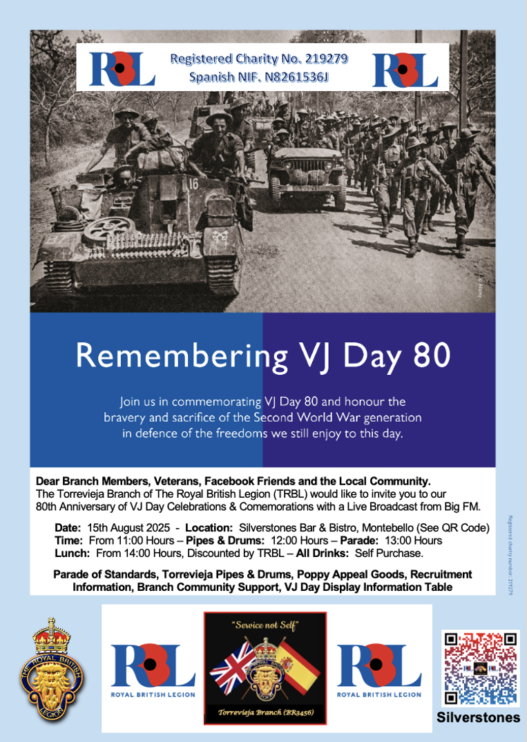 On behalf of the Chairman please find attached the poster for the Torrevieja Branch of The RBL (BR3456) official VJ80 day celebrations which you are all invited to attend.