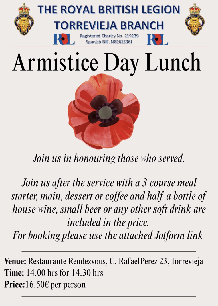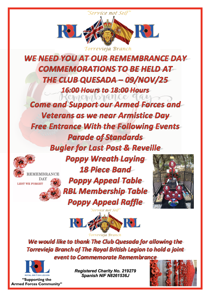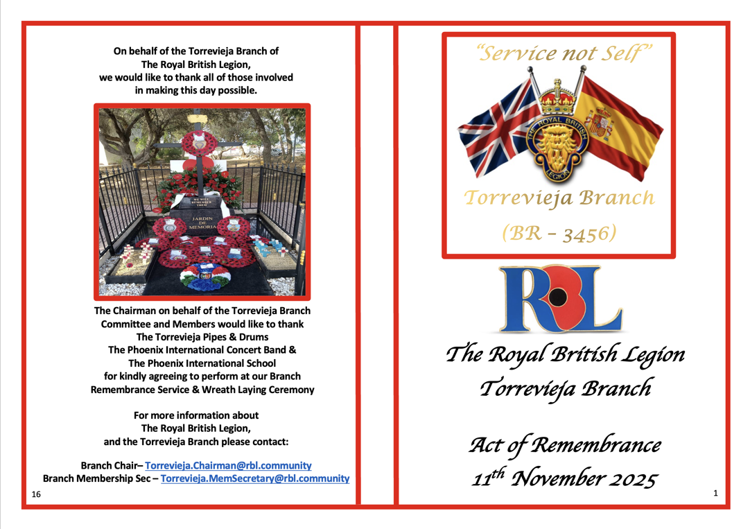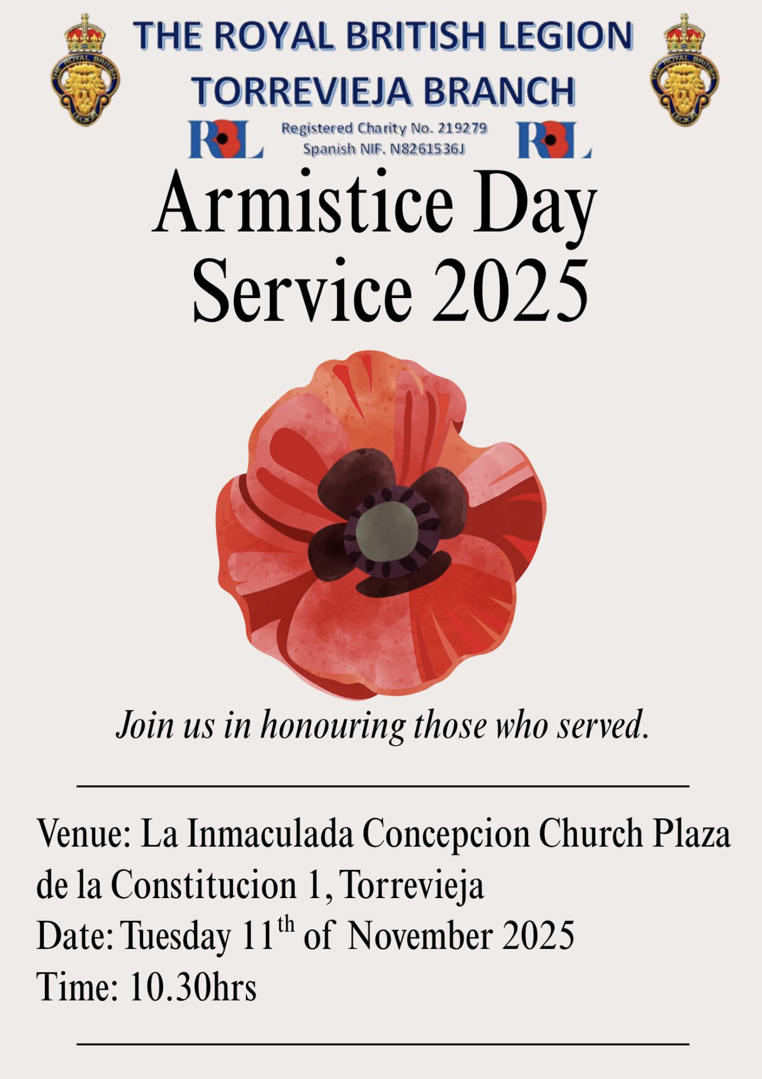 The Branch Armistice/Remembrance Day Parade in Torrevieja Church on 11th November 2025. As a branch we have access to the church at 1030hrs and the committee is inviting ALL members of Torrevieja Branch No 3456 to attend in good numbers. The new committee is now endeavouring to ensure this parade, and many other events not too far away in the diary are as well oiled as they should be and will be requesting membership attendance if possible in such a busy period. brush off the shoes, polish the medals and we hope to see you all there as one. Thank you in advance and on behalf of the committee.
