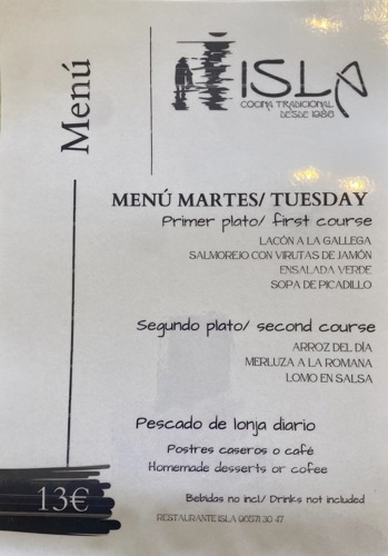 Lunch will be served as Menu del Dia at Bar Isla. The cost is €13 per person, excluding drinks. Menu also attached.