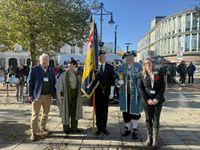 Below: Worthing Town Square Poppy Day. L-R Sussex County RBL President Tim Loughton, Mayor Cllr Cathy Glynn Davies, Merlin Jones with standard, The Town Crier and Worthing PAO Sarah Waghorn.